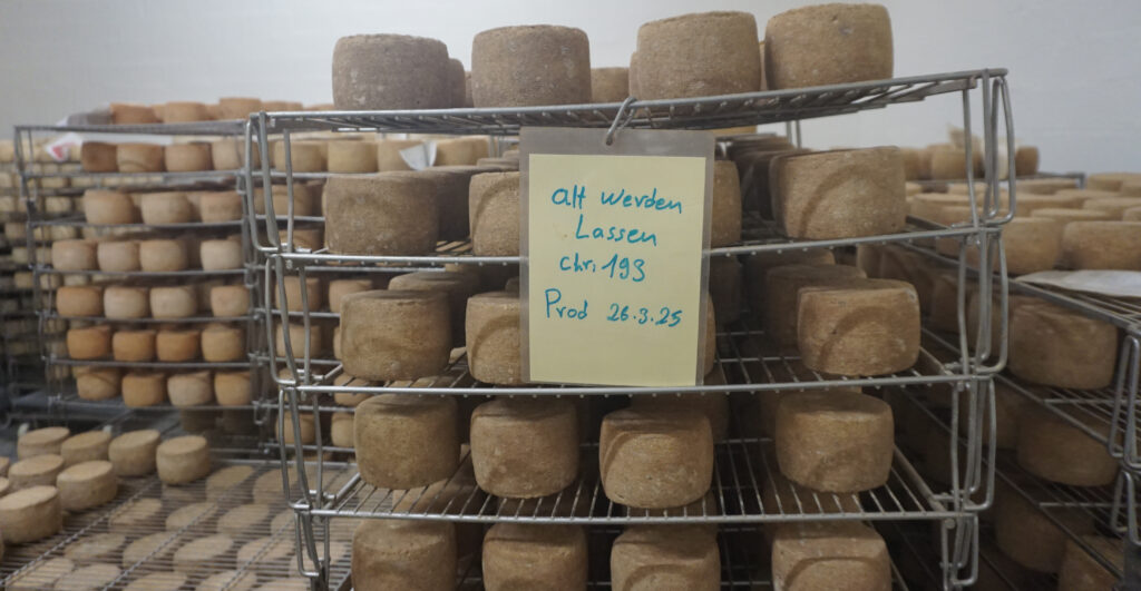 Und – ganz nebenbei – was die Menschen ehemals auf Begleitzetteln zu den Käselaiben dokumentierten, die es auch heute noch manchmal an den Käsebrettern gibt, das weiß heute die Käsepflegemaschine. Welcher Käse stammt aus welcher Milch und liegt auf welchem Brett. So viel Digitalisierung verlangt schon das Biosiegel.