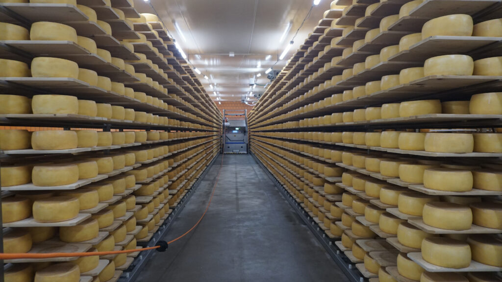 Wir betreten die Räume, in denen der Käse die letzten Schritte zur Reifung macht. In einem dieser Räume lagern die Deichkäse in dreizehn Schichten auf Brettern deckenhoch. Durch den Gang zwischen den Brettern fährt eine Maschine. Hier ist schon automatisiert. Die schweren Bretter mit den Käselaiben hebt die Schweizer Maschine – na klar, eine Maschine aus dem Käseland Schweiz – sie hebt die Käselaibe aus dem Regal, holt sie in ihr Inneres, kippt sie in eine Lake, holt sie wieder heraus, wischt sie ab, und legt sie umgekehrt wieder aufs Brett, und das dann wieder ins Regal. Keine Arbeit, die man sich für einen Menschen wünschen würde. Aber auch diese dann schwere körperliche Arbeit wurde hier früher von Menschen gemacht.