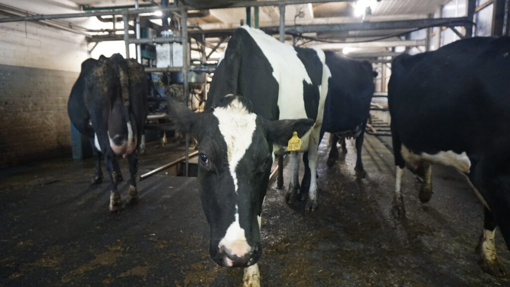 Es gilt der flapsige Spruch: Eine Kuh macht Muh, viele Kühe machen Mühe. Um halb vier am Morgen fangen die Melkerinnen und Melker der Frühschicht an, halb drei am Nachmittag die der Spätschicht. Achtundvierzig Kühe passen auf einmal in den Doppel-Swing-Over-Melkstand. Zwei Leute arbeiten unten zwischen den Kühen, reinigen Euter, legen die Melkbecher an, ein Dritter sorgt dafür, dass die Tiere ohne Drängeln in Ruhe zum Melken kommen und von dort wieder in ihren Stall, oder auf die Weide. Viereinhalb Stunden dauert es jeweils, bis die fünfhundert Kühe gemolken sind.