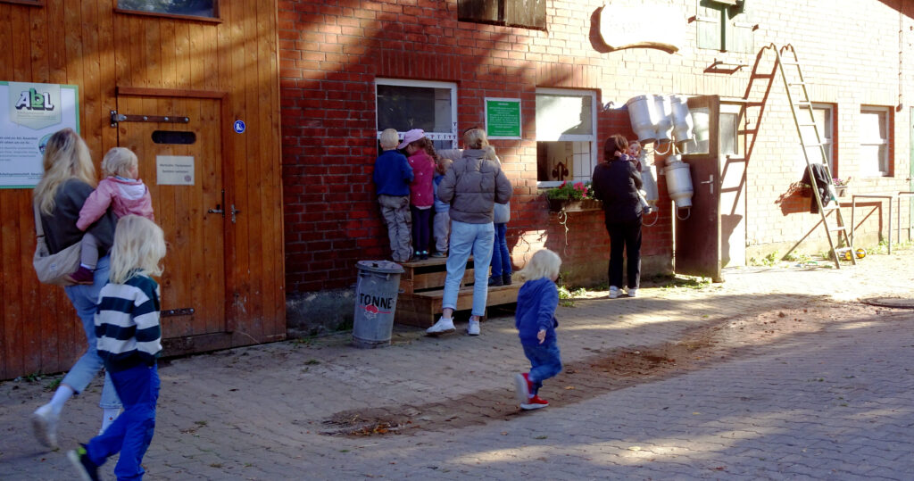 Als ich ihn dort besuche, an einem sonnig warmen Herbstnachmittag, da ist von der Biokrise nichts zu sehen. Im Gegenteil, der Hof brummt vor Geschäftigkeit. Der Parkplatz am Hofladen steht voller Autos. Die Stühle und Tische vor dem Hofladen sind besetzt. Dort wird Kaffee getrunken und Gebäck gegessen. Der Spielplatz zwischen Hofladen und Ställen ist voller Kinder. Dicht gedrängt stehen sie auch auf einem extra für sie dort postierten Tritt am Fenster des Melkstands und schauen hinein.