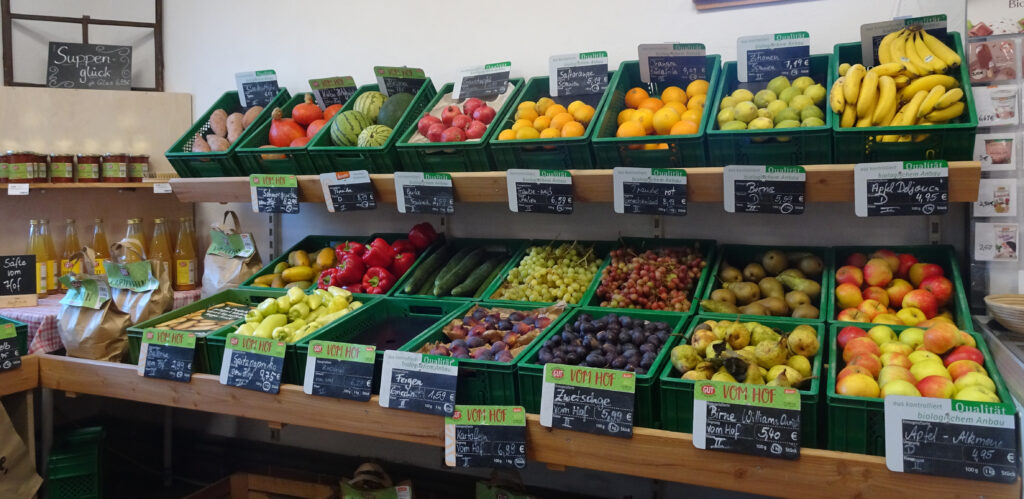 Die Familien, die ihren Ausflug zum Bauernhof beenden, tun das mit Einkaufstüten in den Händen. Im Hofladen gibt es ein großes Sortiment an Gemüse und Obst, diverse Brotsorten, Brötchen und Gebäck und eine große Käseauswahl. Auch sonst ist der Hofladen ein gut sortierter Biomarkt. Und auch gut besucht.