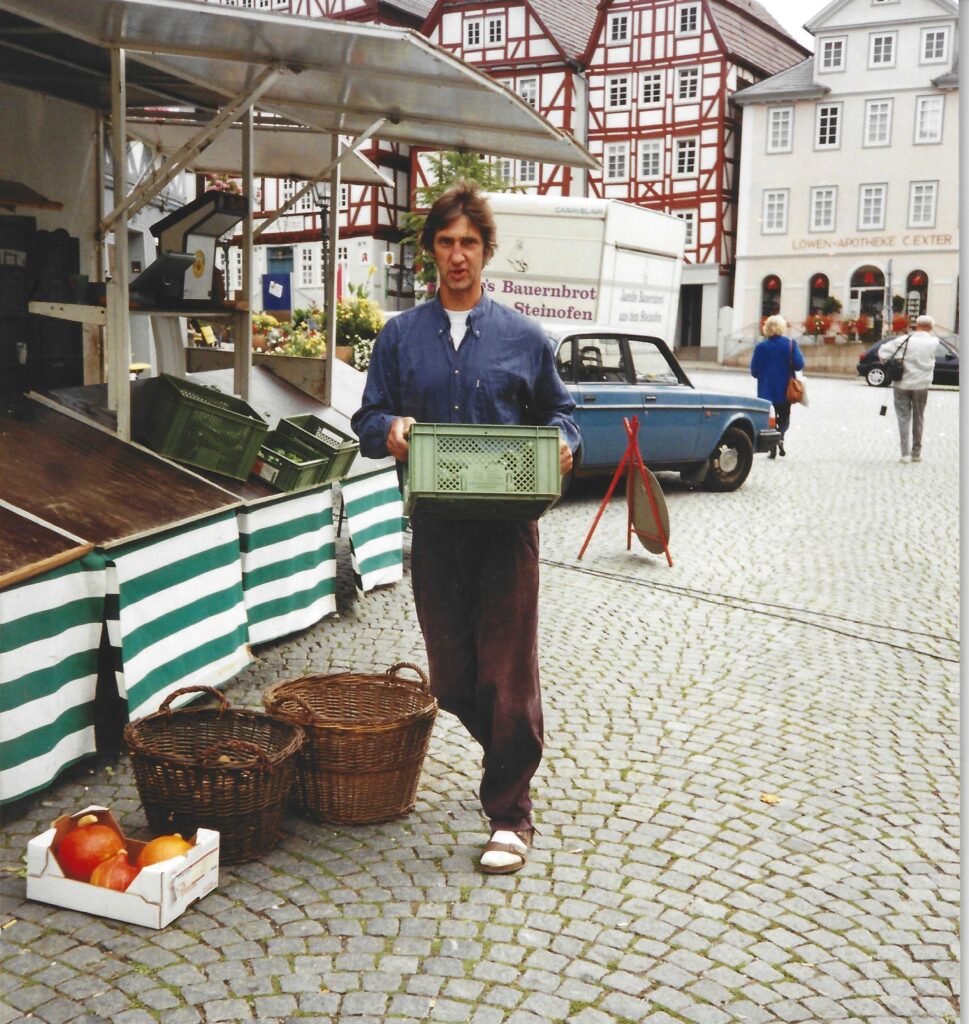 »Sonst haben uns die Kunden gelehrt, was gebraucht und verlangt wird,« sagt Dietmar Groß. Sie kamen an den ersten Markstand, den Christel und Dietmar Groß im Kreisstädtchen Homberg aufgebaut hatten und lobten die Ahle Wurscht, fragten aber gleichzeitig, was denn wohl mit Kartoffeln sei und vor allem: Wo bleibt das frische Gemüse? Wir unterstützen Euch gern bei der Umstellung auf Bio, haben die Kundinnen und Kunden auf dem Markt gesagt, aber nur wegen der Salami auf den Markt und an den Stand zu kommen, das sei ein bisschen aufwendig.